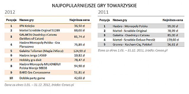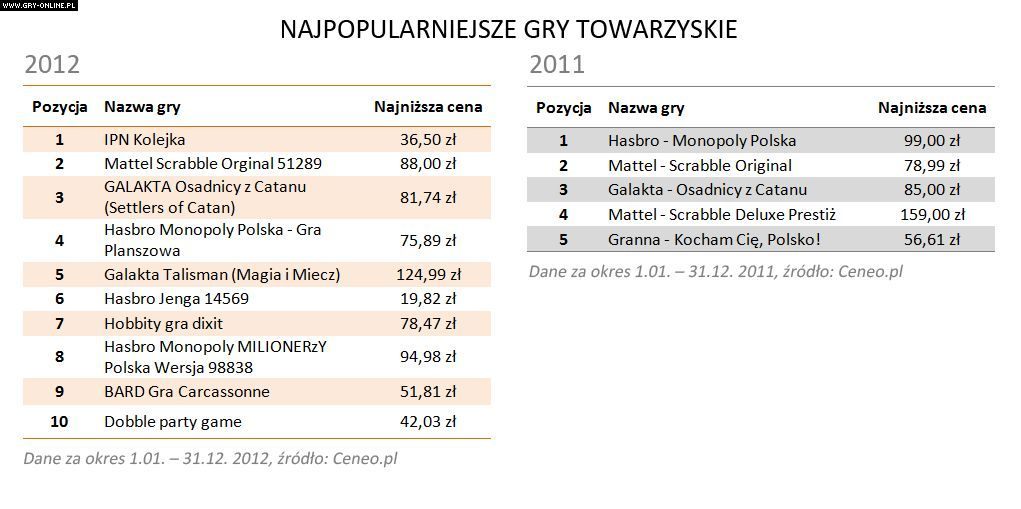 Całkiem nieźle radzą sobie także gry towarzyskie. Choć stanowią jedynie około 10 procent polskiego rynku gier, według serwisu Ceneo.pl ich popularność wzrosła ostatnio niemal dwukrotnie. Wśród gier tego typu, w naszym kraju prym wiodą następujące tytuły: