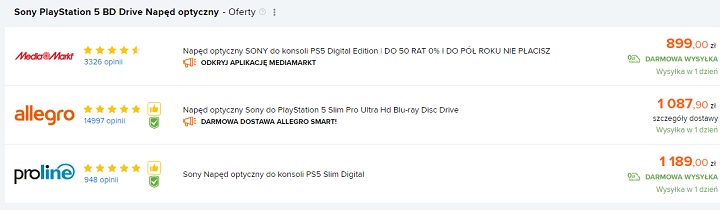 Napęd optyczny do PS5 powrócił także do oferty sklepu Media Markt. Początkowo trzeba było za niego zapłacić 899 złotych. Jednak popyt musiał okazać się znaczny, gdyż obecnie jest on dostępny za 999 złotych. Wzrost cen potwierdza jeden z komentarzy na stronie sklepu oraz porównywarka cen Ceneo.