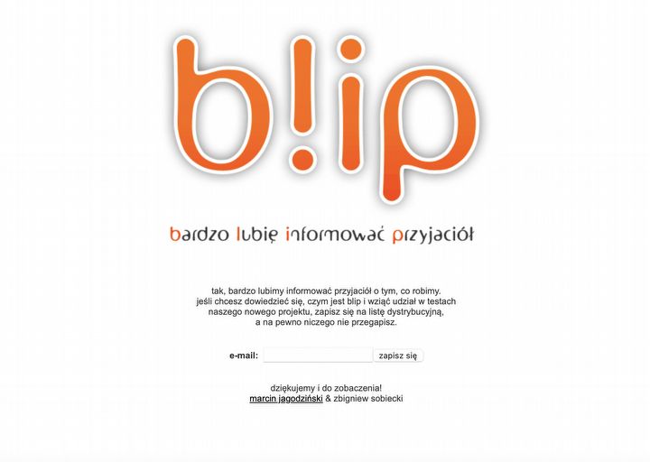 Blip (która to nazwa była skrótowcem od zdania “Bardzo Lubię Informować Przyjaciół”) już po wejściu na stronę pokazywał, że jest typowym serwisem drugiej połowy pierwszej dekady XXI wieku. Zaokrąglenia, cienie, niby błyszczące powierzchnie – ten styl graficzny był wtedy bardzo widoczny nie tylko w designie stron internetowych, ale też nawet w systemach operacyjnych. MacOS X Tiger czy Windows Vista są tego najlepszymi przykładami. Oto jak usługę opisał Zbigniew Sobiecki, jeden z dwóch twórców Blipa: