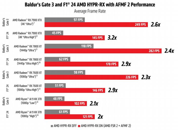 Największe wrażanie robi nowy generator klatek AMD Fluid Motion Frames 2. Według producenta w niektórych tytułach można dzięki niemu uzyskać średnio 2,5 razy więcej FPS-ów. Dodatkowo firma miała usprawnić omawianą technologię, dzięki czemu gracze mogą liczyć na mniejsze opóźnienia i poprawioną grafikę. Wprowadzono między innymi opcję Radeon Chill, umożlwiającą ograniczenie ilości generowanych klatek, dla zwiększenia jakości. Poniżej możecie zapoznać się z testami AFMF 2 przeprowadzonymi przez AMD.