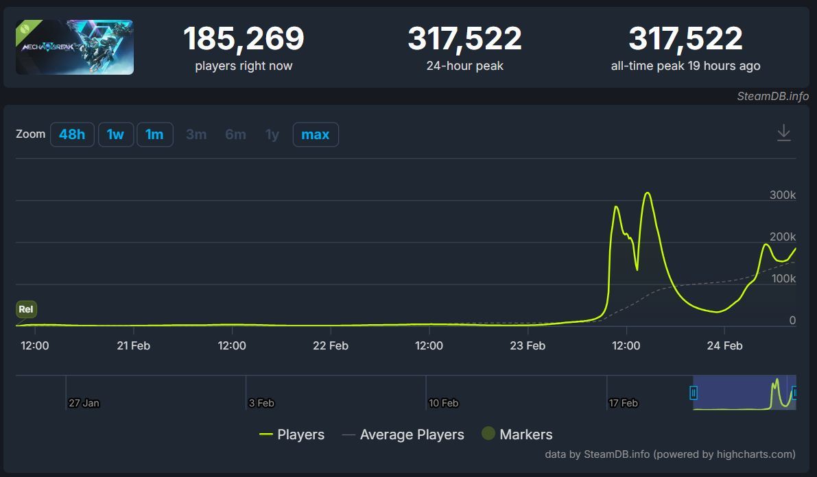 Umówmy się: nawet na tle innych darmowych wersji demonstracyjnych wynik nowego, wieloosobowego projektu studia Amazing Seasun Games (Ballads of Hongye) robi wrażenie. W szczytowym momencie w Mecha Break Demo bawiło się ponad 317 tysięcy graczy naraz (via SteamDB). To więcej, niż wynosi „peak” Kingdom Come: Deliverance 2, co pozwalałoby uznać debiut dema za sukces twórców.