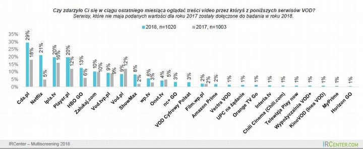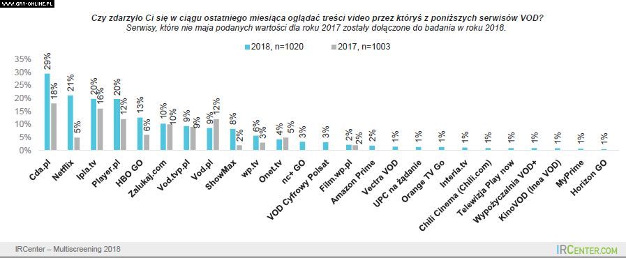 Z roku na rok zwiększa się popularność platform VOD w Polsce. Z badań przeprowadzonych przez firmę IRCenter wynika, że najchętniej wybierane są Netflix i Cda.pl. Raport pokazuje także, że oglądamy treści na wielu urządzeniach.