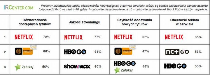 Mimo mniejszej popularności Netfliksa względem Cda.pl, serwis został najlepiej ocenianą platformą VOD w Polsce. Przy ocenie wzięto pod uwagę cztery aspekty: różnorodność dostępnych tytułów, jakość streamingu, szybkość dodawania nowości, a także obecność reklam. W każdej z tych kategorii wygrał Netflix. Chociaż Cyfrowy Polsat oraz HO również mocno zaznaczyły swoją obecność.