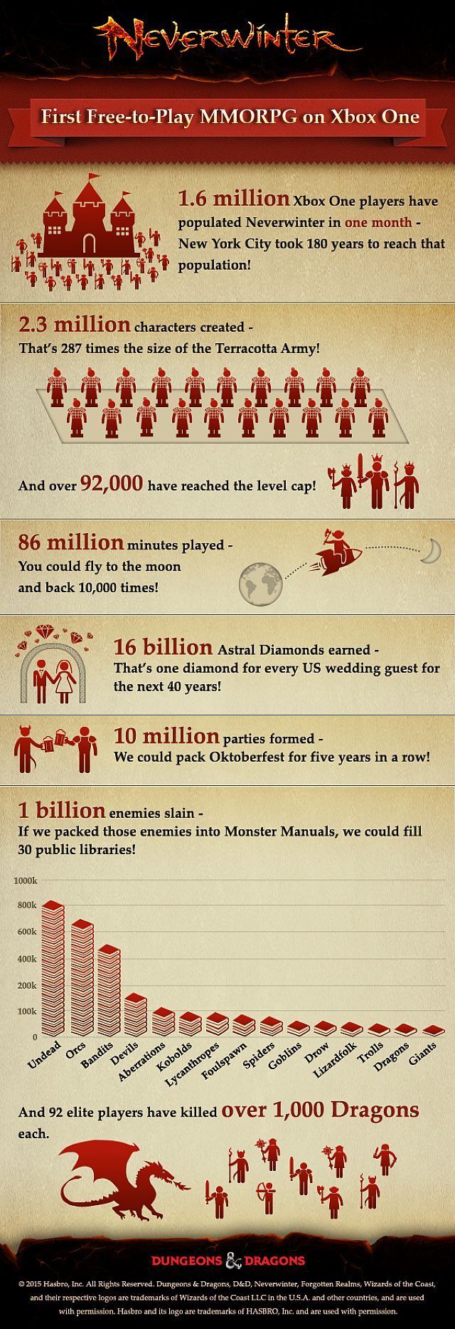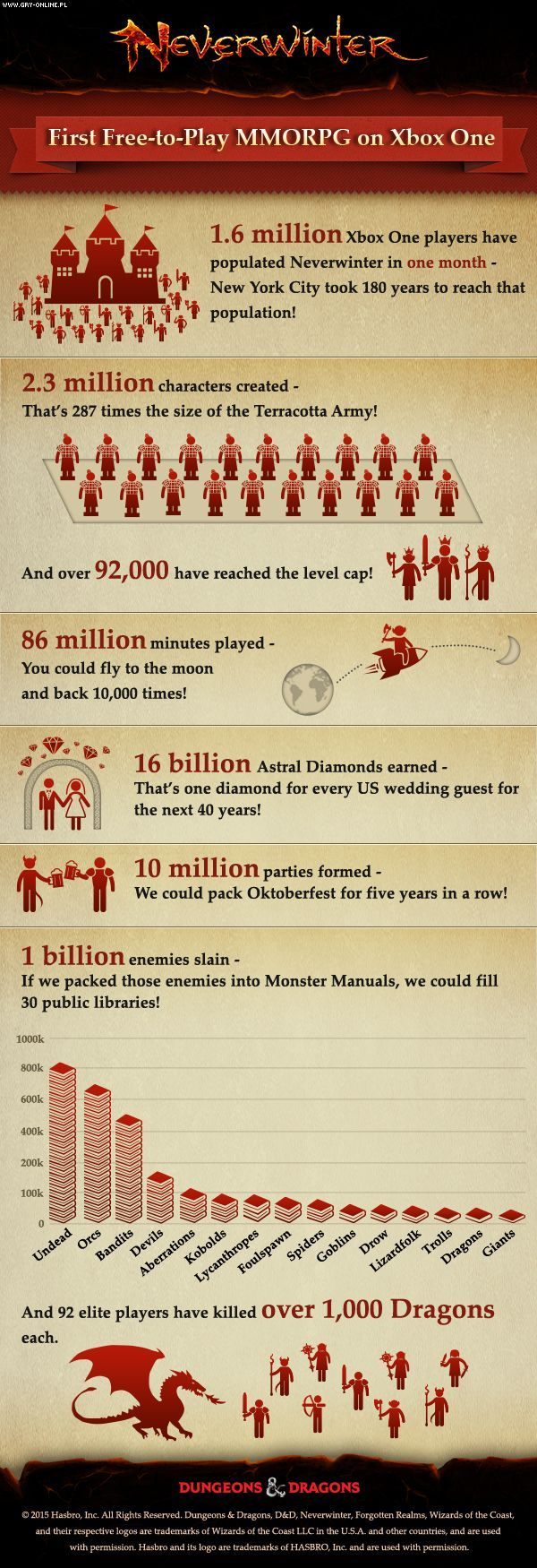 Firma Perfect World Entertainment, wydawca sieciowego RPG Neverwinter, pochwaliła się na swojej oficjalnej stronie wynikami gry na konsoli Xbox One. Tytuł, który swoją premierę na sprzęcie koncernu Microsoft miał 31 marca, w ciągu pięciu tygodni zachęcił do rozgrywki ponad 1,6 miliona graczy. Z tej okazji przygotowano specjalną infografikę, na której zawarto więcej szczegółów na temat popularności gry. Wszystkie niżej wymienione dane dotyczą tylko i wyłącznie wersji na XONE.