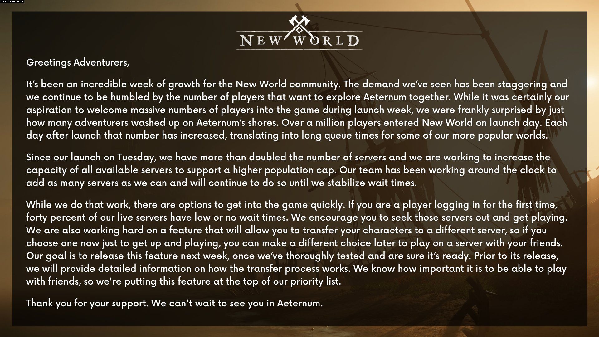W niedawnym wpisie na Twitterze przedstawiciele ekipy Amazon Games zapewnili, że obecnie ich priorytetem jest poprawa sytuacji z serwerami New World, w tym dodanie możliwości przeniesienia postaci z jednego na drugi. Jest to odpowiedź na prośby graczy.