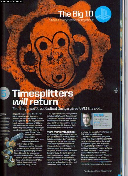 Czytamy w nim, że prace nad czwartą odsłoną TimeSplitters w wersji na PS3 już trwają. Informacja zamieszczona w OPM nie zawiera niestety żadnych detali poświęconych systemowi rozgrywki oraz kwestiom fabularnym. Dowiadujemy się z niej jednak, że pod względem humoru najnowsza część będzie najpewniej trzymać poziom poprzednich odsłon cyklu. Świadczy o tym choćby logo gry, w sposób jawny nawiązujące, a przy tym parodiujące charakterystyczną grafikę z gry Gears of War. W artykule znalazła się również informacja, z której wynika, że małpki (jedne z bohaterek serii) będą walczyć m.in. w nowych kombinezonach bojowych przywodzących na myśl strój Master Chiefa – głównego bohatera serii Halo. Najprawdopodobniej tego typu atrakcji znajdzie się w grze jeszcze przynajmniej kilka.