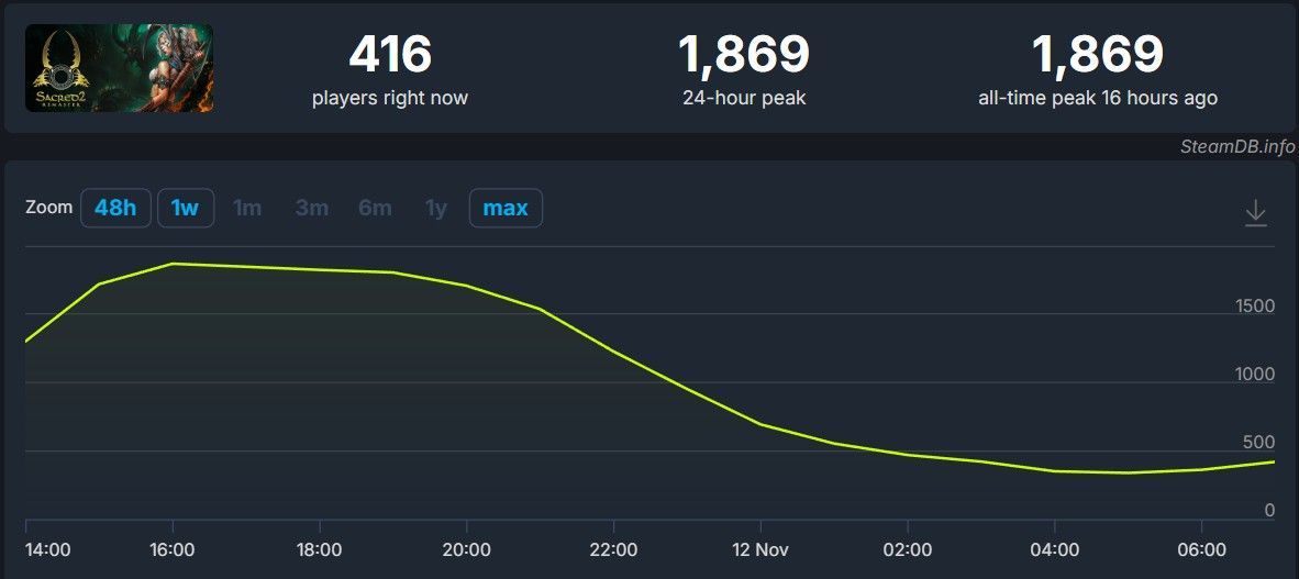 Sacred 2 Remaster nie wzbudził wielkiego zainteresowania na platformie Valve. W szczytowym momencie w grze bawiło się nieco ponad 1800 graczy jednocześnie. To wynik o zaledwie około 700 osób wyższy niż w przypadku oryginalnego Sacred 2.