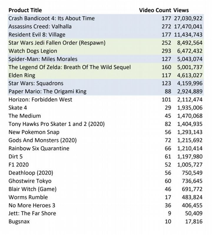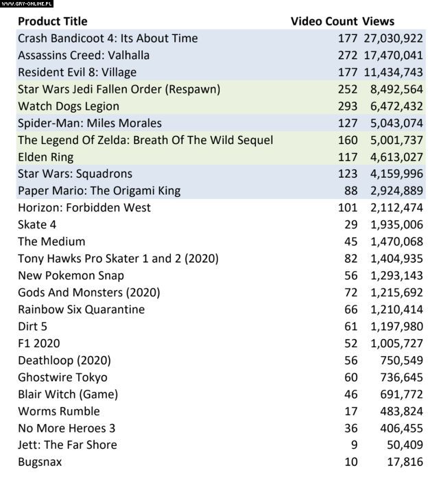 Oczywiście zainteresowanie prasy to jedno, ale co z mediami społecznościowymi? Fancensus porównał też liczbę wyświetleń i materiałów (wpisów lub filmików w zależności od platformy) opublikowanych w serwisach YouTube, Facebook oraz Twitter w ciągu trzech dni od zapowiedzi. Tu również prym wiodły gry ujawnione w tym roku. Crash Bandicoot 4: Najwyższy Czas dominował na Facebooku i YouTube, a Assassin’s Creed: Valhalla dominował na Twitterze. Oba tytuły znacząco przebiły wyniki zeszłorocznych ogłoszeń na YouTube, wliczając w to Star Wars Jedi: Upadły Zakon oraz kontynuację The Legend of Zelda: Breath of the Wild. Bynajmniej nie są to wyjątki. We wszystkich trzech zestawieniach pierwsze dziesięć pozycji zajmują głównie produkcje ujawnione w tym roku. Innymi słowy, brak targów E3 2020 zdecydowanie nie zaszkodził wielkim wydawcom – wręcz przeciwnie.