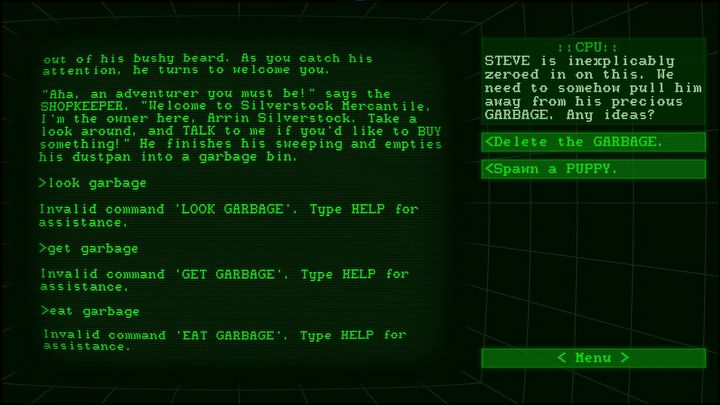 Użytkownikiem gry, którą prowadzimy, jest STEVE - gracz, który chyba nie do końca przeczytał instrukcję obsługi gry, o ile w ogóle. Jest chaotyczny i niepoukładany, chociaż nie można mu odmówić tego, że wie, czego chce od swojej przygody. I to naszym zadaniem jest doprowadzenie jego podróży do szczęśliwego zakończenia… lub pokazanie mu, że decyzje mogą mieć swoje konsekwencje. Gra nie oferuje nam zbyt wiele w kwestii grafiki, ale udźwiękowienie mnie zachwyciło - każda kwestia gry była świetnie odegrana, nawet jeśli były to nie do końca zrozumiałe komendy STEVE’a. Kontrola otoczenia czy postaci, na jakie wpadał STEVE, sprawia radość, a nasze odpowiedzi rozciągają się od tych klasycznych po dziwne i całkowicie szalone. Gra na dodatek doskonale pamięta wydarzenia, jakie zaszły i często nawiązuje do wcześniej podjętych decyzji. Sam sposób prowadzenia gry jest naturalnie zabawny i niejednokrotnie zdarzało mi się głośno roześmiać.
