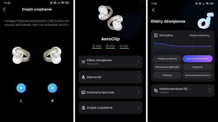 Wbudowany equalizer pozwala na wybranie jednego z gotowych schematów lub stworzenie własnych. I muszę przyzwyczaić się, że zapewnia on naprawdę odczuwalne zmiany w brzmieniu. Dla osób, które lubią sprawdzić każdy ton, siłę basów oraz inne ustawienia dźwiękowe powinno to wystarczyć do komfortowego korzystania z AeroClip.