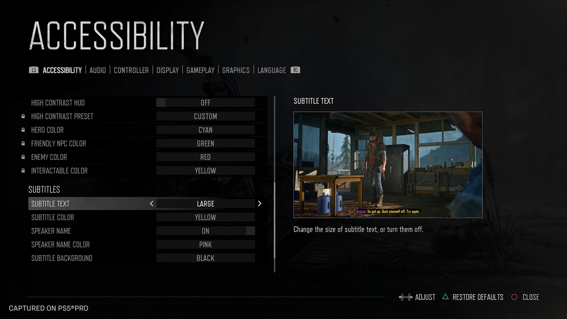 Jednym z najważniejszych ulepszeń w zakresie dostępności w Days Gone Remastered jest w pełni konfigurowalny tryb wysokiego kontrastu. Uzupełnia on funkcję Wysokokontrastowego HUD, która została wprowadzona w oryginalnej wersji gry, aby ułatwić nawigację i poprawić widoczność.
