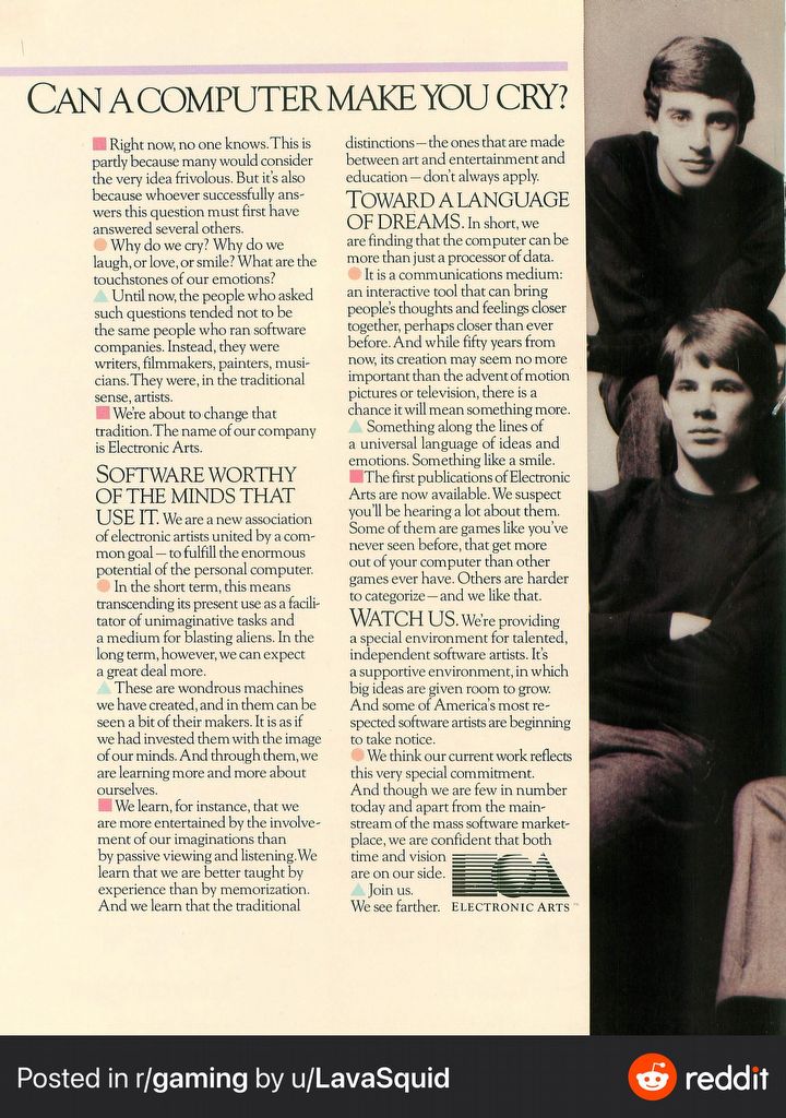 EA na Twitterze obserwuje około 6,4 mln użytkowników. Wielu z nich nie zareagowało pozytywnie na ów tweet, w tym sławy branży growej, jak Geoff Keighley (gospodarz corocznej gali The Game Awards), który w swoim komentarzu nt. omawianego wpisu zamieścił artykuł sprzed kilku dekad, opisujący, jak to EA stara się traktować tworzenie gier niczym sztukę.