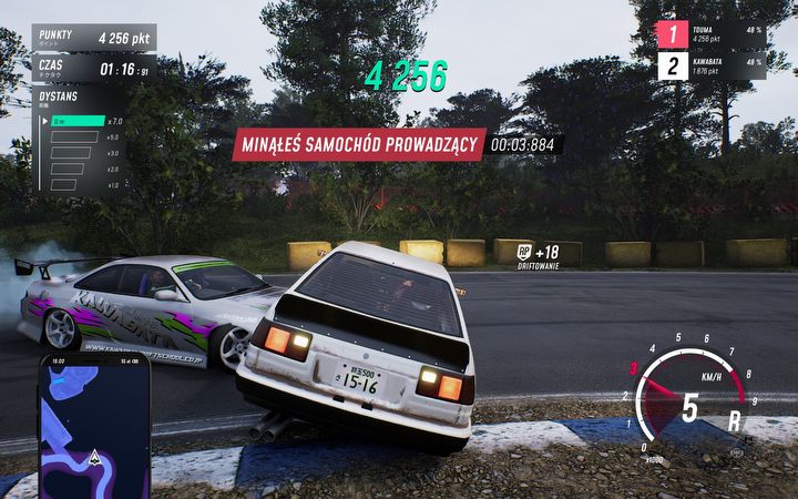 Jeśli chodzi o ruch uliczny jest tu raczej symboliczny i można go całkowicie wyłączyć w opcjach. Sztuczna inteligencja nie zachwyca złożonością – jeśli zablokujemy ruch, nie będzie podejmować prób wymijania nas czy manewrowania. Podobnie nasi rywale, którzy mają odgórnie ustalony przejazd trasy i nie reagują na nasze poczynania. Jeśli w wyścigu kogoś wyprzedzimy, to ten dalej będzie skupiony na wykonywaniu driftu, nawet jeśli celem jest jak najszybsze dotarcie do mety.