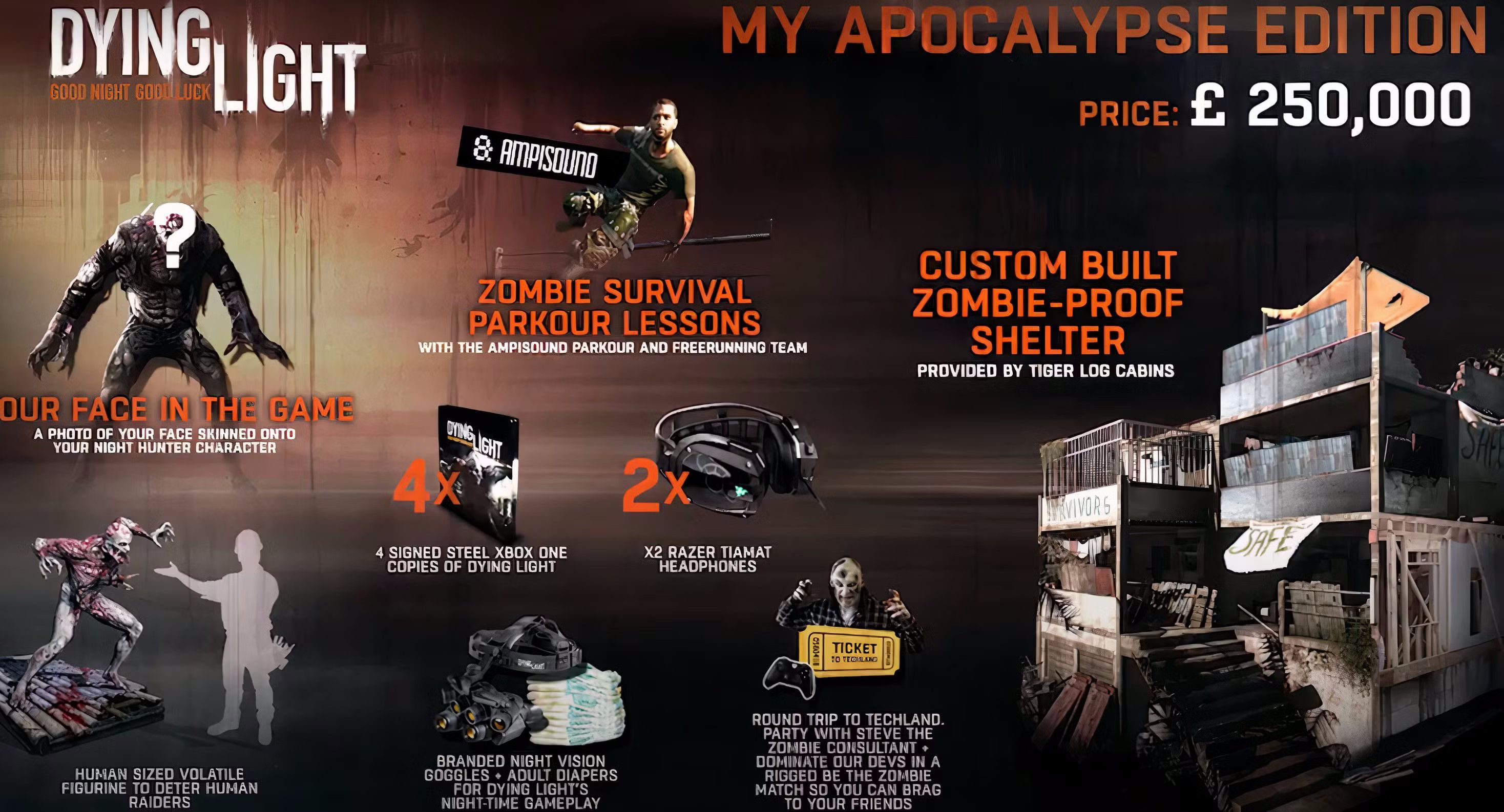 Jednym z takich przypadków jest Dying Light, którego pierwsza odsłona doczekała się niezwykłej edycji o nazwie „My Apocalypse”. Wyceniono ją na skromne 250 tysięcy funtów, co dziś w przeliczeniu daje ponad 1,2 miliona złotych. Nabywca mógł liczyć na: