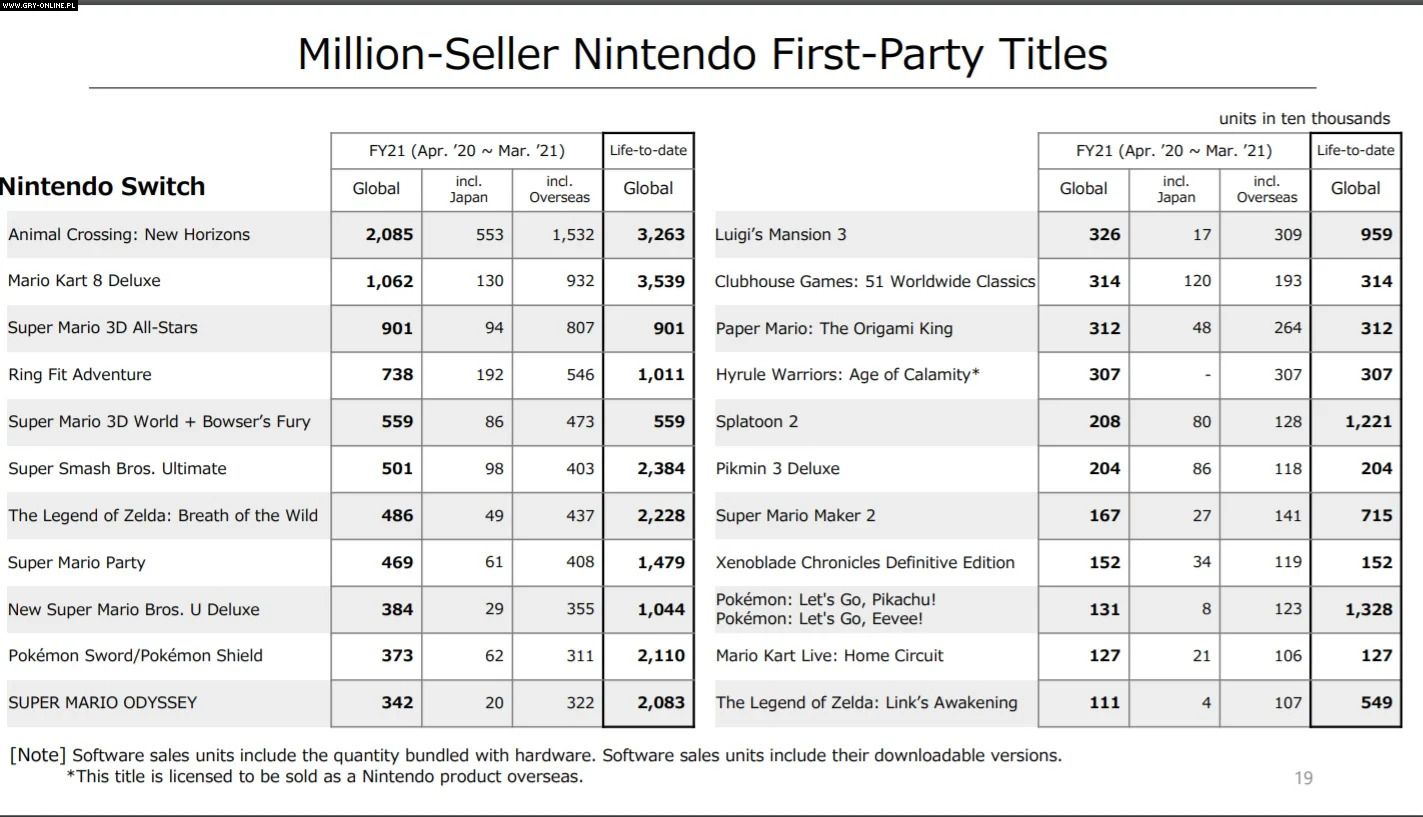 Oznacza to, że Nintendo w dobrej kondycji przetrwało czasy pandemii, a Nintendo Switch pnie się w górę rankingu najlepiej sprzedających się konsol. W raporcie znajduje się także lista najbardziej dochodowych i najlepiej sprzedających się w ubiegłym roku gier na Switcha. Spośród 36 tytułów, które osiągnęły wynik powyżej miliona egzemplarzy, aż 22 pochodzą od Nintendo. Zestawienie prezentujemy poniżej: