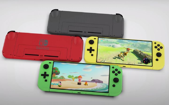 Szczególną uwagę zwraca nieco większy względem pierwszego Switcha ekran – 7 cali zamiast 6,2 – oraz odrobinę mniejsze, choć zachowujące kształt oryginalnych, ramki wokół niego. Wzorem Switcha Lite przygotowano także kilka wersji kolorystycznych. Co więcej, jeśli zdecydujemy się na żółtą lub czerwoną konsolę, również obramowanie wyświetlacza powinno mieć barwę wybraną przez nas, a nie czarną. Modyfikacji poddano także analogi, aby były ciut większe i wygodniejsze w użyciu, oraz zmieniono rozmiar przycisków Share i Home. Najbardziej pożądaną zmianą ma być jednak nowa podstawka pod konsolę, która – w odróżnieniu od tej z pierwszego Switcha – ma zapewnić stabilne oparcie dla nachylonego do nas pod kątem urządzenia.
