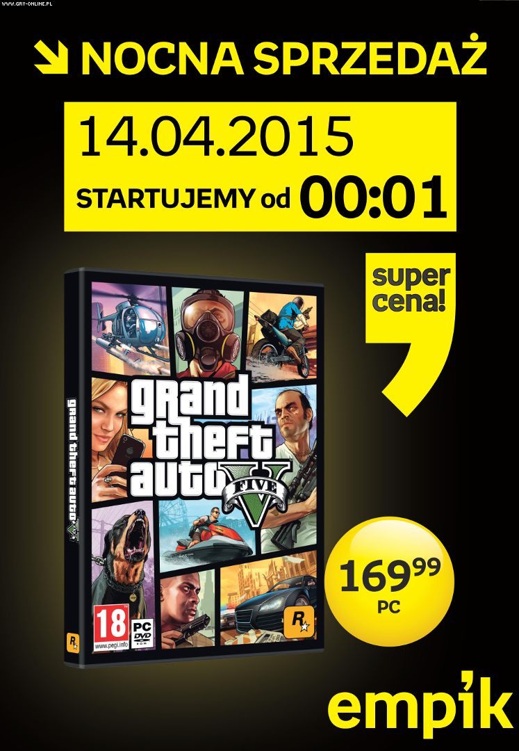 Dobre wieści dla osób, które chcą kupić pudełkowe wydanie GTA V na PC. W wybranych miastach salony sieci Empik organizują nocną sprzedaż gry w promocyjnej cenie. Wydarzenie rozpocznie się 14 kwietnia 2015 roku o godzinie 00:01.