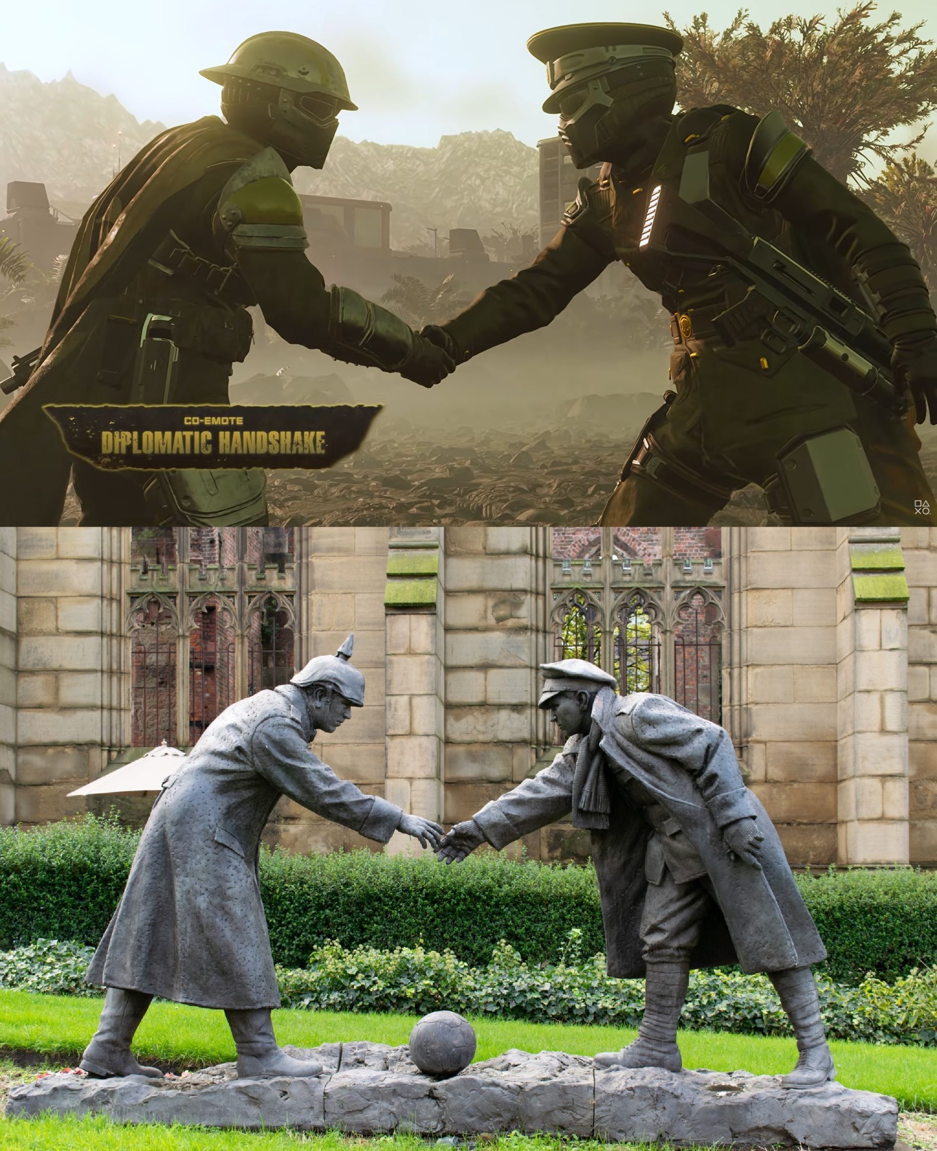 Na pierwszy rzut oka wygląda ona dość zwyczajnie. Ot, po prostu dwóch helldiverów grzecznościowo podaje sobie dłonie z lekkim zawahaniem. Sposób, w jaki to robią nie jest jednak dziełem przypadku. To tak naprawdę nawiązanie do jednego z najgłośniejszych epizodów I wojny światowej. Mowa tu oczywiście o słynnym rozejmie bożonarodzeniowym.