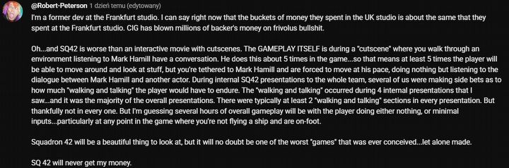 Podczas gdy wyczekiwana produkcja Squadron 42 pozostaje enigmą, w sieci trwają dyskusje, czy tytuł ten nie przypomina bardziej interaktywnego filmu niż klasycznej gry. Do tych zarzutów postanowił odnieść się youtuber Robert Peterson, który utrzymuje, że do 2022 roku pracował w oddziale studia Cloud Imperium Games we Frankfurcie. Jego zdaniem Squadron 42 skupi się na „chodzeniu i rozmawianiu”.