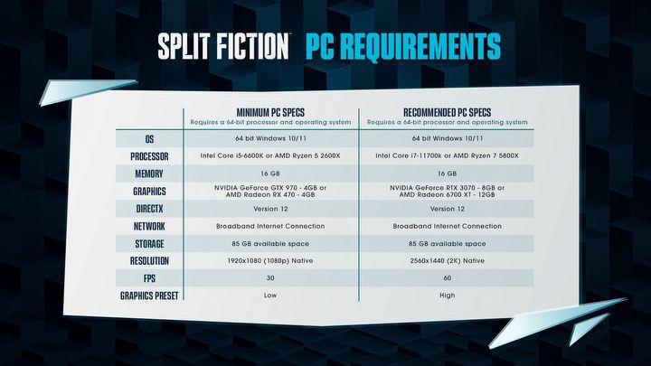 Jak widzicie nie są one bardzo wysokie. Kolejna dobra wiadomość jest taka, że podobnie jak It Takes Two, Split Fiction będzie działać na Steamie bez uruchomionej w tle aplikacji EA. Wyjątek ma stanowić sytuacja, w której zechcemy połączyć się ze znajomym grającym na innej platformie – wtedy konieczne okaże się skorzystanie z darmowego konta Electronic Arts.