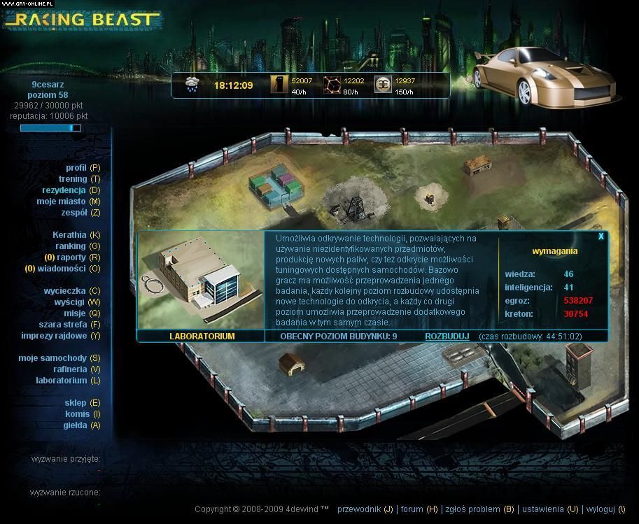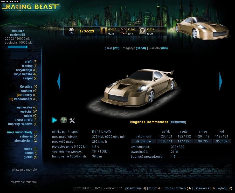 Racing Beast to pierwsze dzieło studia 4dewind. Rzecz dzieje się na planecie Kerathia, czyli miejscu pełniącym rolę Ziemi gdzieś w innym uniwersum. Jej władcą zostać może każdy, kto posiada wystarczająco dużo szybkich pojazdów, które umożliwią zwycięstwo w niezliczonej ilości wyścigów, a na końcu – pokonanie obecnie panującego mistrza. Jesteście chętni? Dysponujemy bazą wypadową, którą możemy rozbudowywać i do której wstawiamy kolejne samochody (jest ich w grze 32). Zwyciężając w każdym kolejnym z wyścigów, które odbywają się na terenie 362 miast planety oraz pustkowiach i bezdrożach, zdobywamy doświadczenie oraz fundusze na rozwój naszej floty. Dreszczyku dodaje fakt, że razem z Tobą o miano najlepszego walczą tysiące innych graczy. Poznawaj ludzi, szpieguj, rzucaj wyzwania, odkrywaj sekrety, wygrywaj.