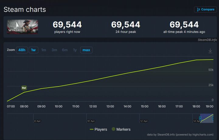 Tytuł zdecydowanie przyciągnął uwagę, dzięki czemu zdołał wskoczyć na pierwsze miejsce wśród globalnych bestsellerów na Steamie. Według danych serwisu SteamDB Windrose w szczytowym momencie przyciągnęło przed ekrany ponad 69 tysięcy użytkowników jednocześnie, ale nie zapowiada się, by wskazówka licznika dotarła już do limitu.