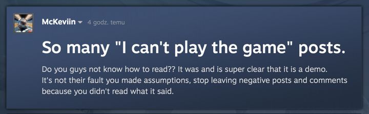 Ludzie, czy wy nie umiecie czytać? Od początku było jasne, że to jest demo. To nie ich wina, że założyliście coś innego, więc przestańcie zostawiać negatywne komentarze tylko dlatego, że nie przeczytaliście opisu.