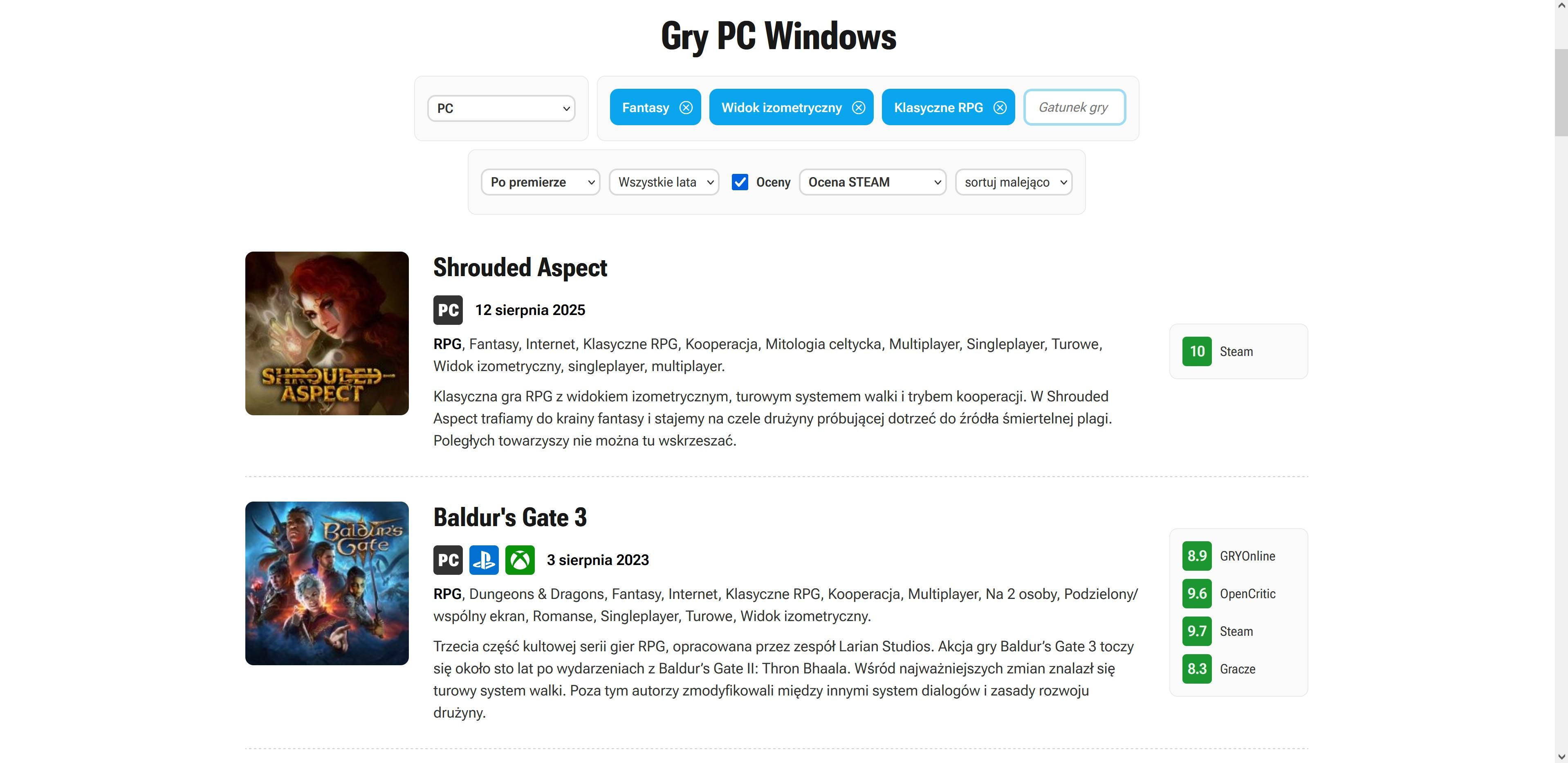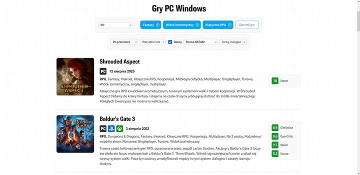 Oczywiście podawanie ocen ze Steama i OpenCritic nie zdałoby się na wiele, gdybyśmy nie zadbali o możliwość listowania gier według tego kryterium. Tutaj na scenę wkracza nowa wyszukiwarka, która pozwala z jednego miejsca dostosować szereg parametrów, według których chcecie zawęzić wybór tytułów – od platformy, przez gatunek, tematyki i termin premiery (z dokładnością do roku, a nawet miesiąca), po różnego rodzaju oceny. Za jakiś czas dodamy do tego opcję wykluczenia pozycji pozbawionych polskiej wersji językowej.