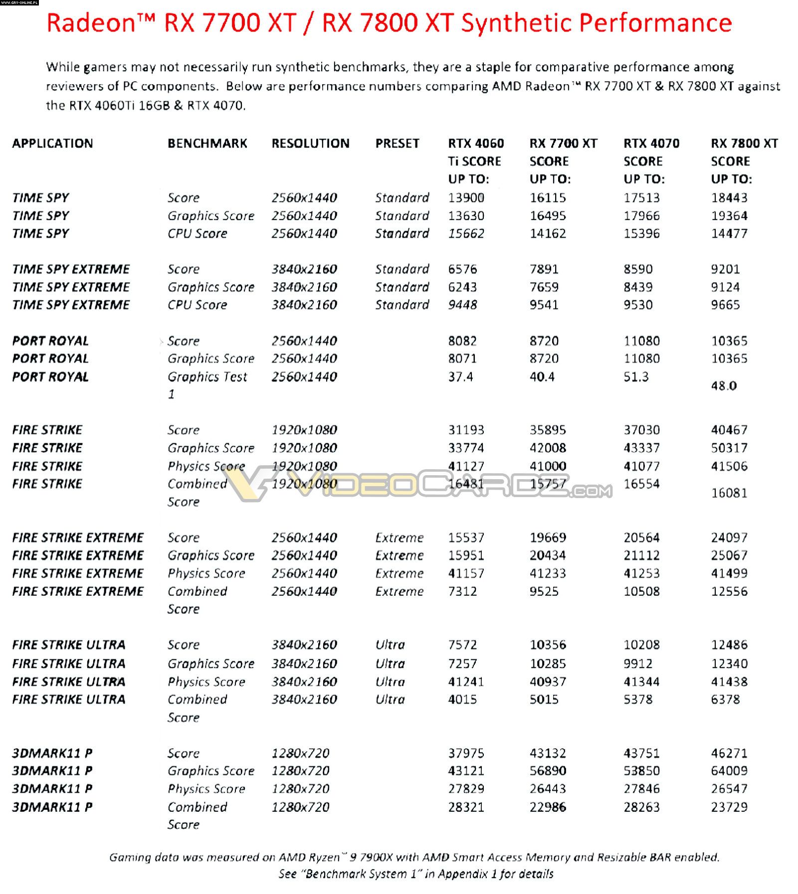 Portal VideoCardz udostępnił również wyniki testów z popularnego benchmarku 3DMark. Jak można zauważyć na załączonej powyżej tabeli, w większości przypadków RX-y pokonują swoich rywali. Jednak w przypadku testu Port Royal, który uwzględnia Ray Tracing RX 7800 XT osiąga gorsze wyniki od RTX-a 4070.