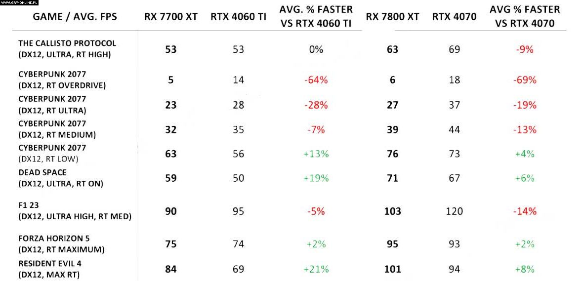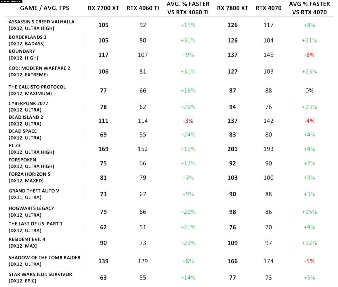 Podobnie jest w przypadku RX-a 7700 XT, który bez włączonego RT, wyprzedza RTX-a 4060 Ti o około 16%. Warto przy tym wspomnieć, że omawiane karty były testowane w rozdzielczości 1440p.