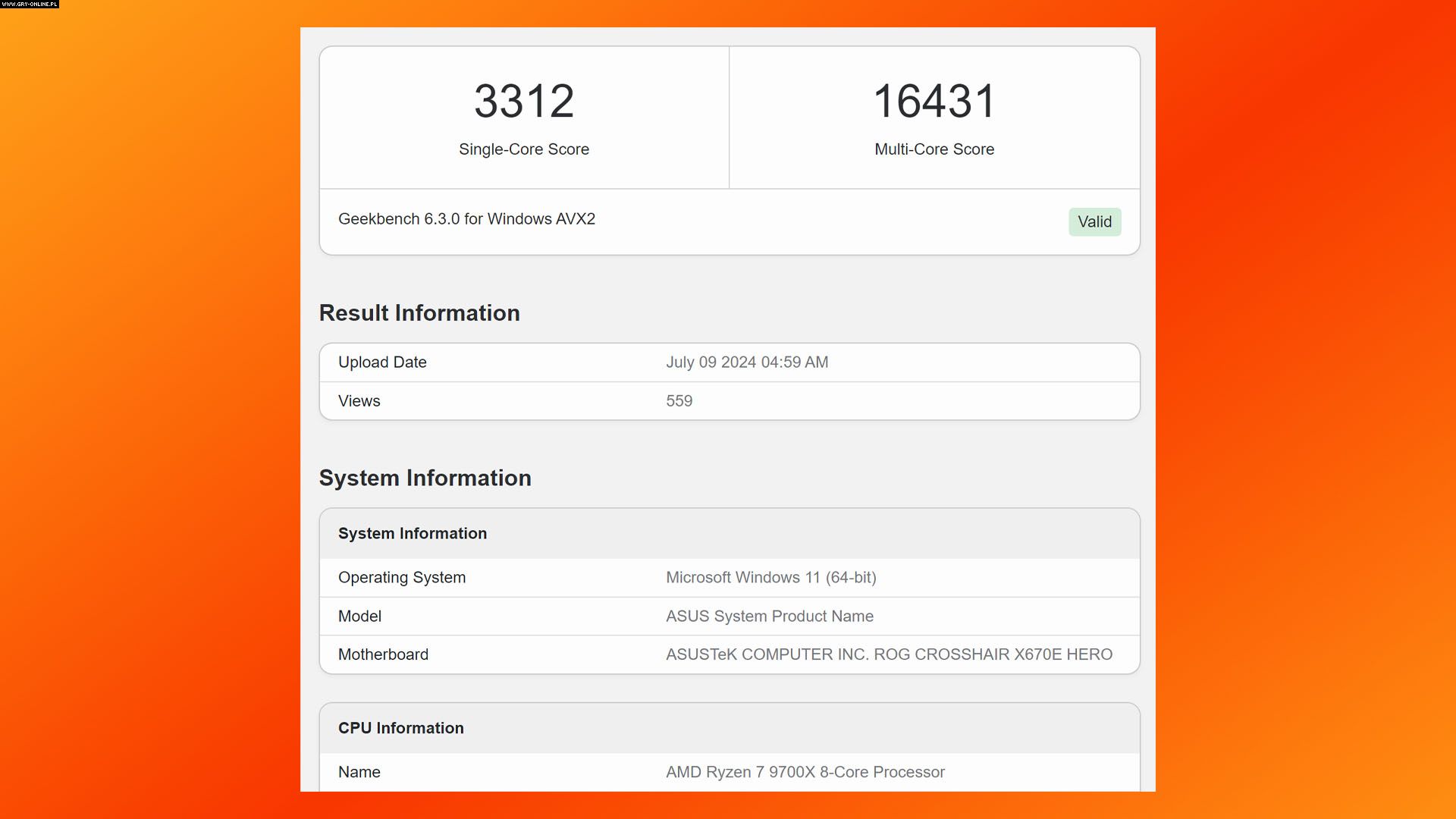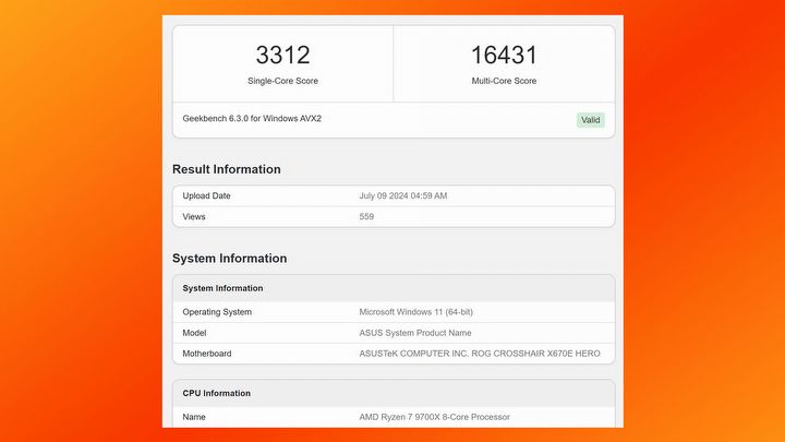 Nieco lepiej poradził sobie ośmiordzeniowy Ryzen 7 9700X. W trybie jednordzeniowym, osiągnął on wynik na poziomie 3312 punktów, a w wielordzeniowym dobił do 16431 punktów. W porównaniu z jego poprzednikiem, czyli Ryzenem 7 7700X, są to wzrosty odpowiednio o 13,7% i 7,6%.