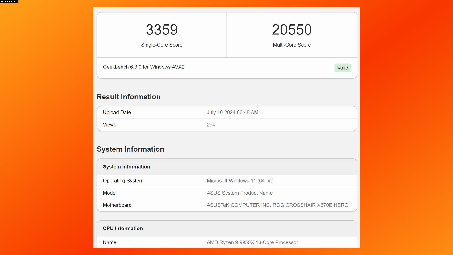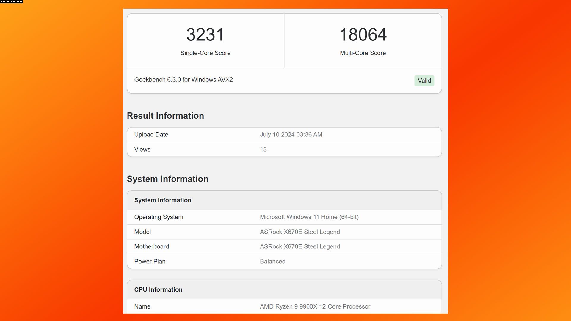 Na końcu przyjrzyjmy się wynikom, jakie osiągnął 12-rdzeniowy Ryzen 9 9900X. W trybie jednordzeniowym zgarnął on 3231 punktów, a w wielordzeniowym 18064. Jednak w przeciwieństwie do trzech wymienionych wyżej procesorów, które na potrzeby testów umieszczono na płycie głównej ASUS ROG Crosshair X670E Hero, wyposażonej w 32 GB pamięci RAM DDR5 6000 MHz, ten ostatni zamontowano na ASRock X670E Steel Legend, z 32 GB pamięci RAM DDR5. Miejcie to na uwadze analizując podane rezultaty.