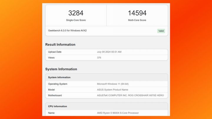 Na początek przyjrzyjmy się dwóm bardziej budżetowym podzespołom. Ryzen 5 9600X w założeniu ma stanowić odpowiednik Ryzena 5 7600X i posiadać sześć rdzeni. W teście Geekbench udało mu się osiągnąć 3284 punktów na jednym rdzeniu, a 14594 punktów na wielu. To odpowiednio o 14,5% i 13,7% lepiej, niż w przypadku wspomnianego Ryzena 5 7600X.