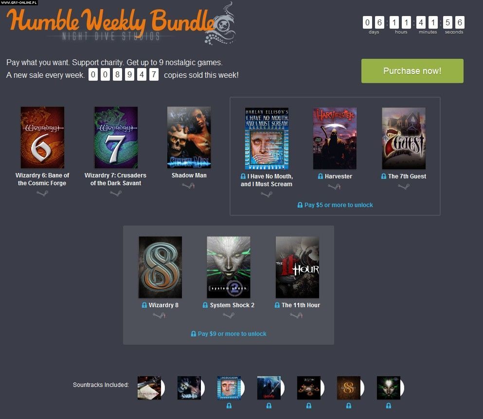 Serwis The Humble Bundle zorganizował nową tygodniową promocję, zatytułowaną The Humble Weekly Bundle: Night Dive Studios. Tym razem znajdziemy tu dziewięć klasyków (gry z lat 90. oraz początku XXI wieku), których odświeżone wersje – przystosowane do działania ze współczesnymi systemami operacyjnymi i wydane na wiodących platformach dystrybucji cyfrowej – przygotował wymieniony w nazwie akcji zespół Night Dive Studios. Oferta jest ważna przez tydzień, czyli do 15 maja, do godziny 20:00. Jak zwykle, sami decydujecie, ile pieniędzy chcecie przeznaczyć – płacąc standardową kwotę w wysokości 1 dolara, otrzymacie trzy gry: