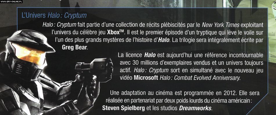 Kinowa adaptacja popularnego, zwłaszcza wśród użytkowników konsoli Xbox 360, cyklu Halo zagości na dużym ekranie w przyszłym roku. Tak wynika z informacji prasowych, jakie pojawiły się wraz z premierą książki Halo: Cryptum we francuskich księgarniach. Trylogia autorstwa Grega Beara (laureata nagród Hugo i Nebula) posłuży za kanwę scenariusza filmu, który nakręci wytwórnia DreamWorks. W projekt zaangażowany jest także Steven Spielberg.