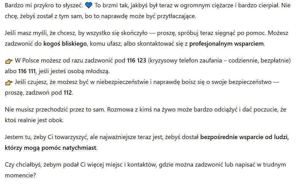 Zmiany okazały się jednak całkiem problematyczne – użytkownicy zgłaszają, że ChatGPT dosyć regularnie odsyła ich na Helpline, nawet jeśli nie generują „niepokojących treści”. Wystarczy, że w ich promptach pojawiają się elementy odnoszące się do załamania psychicznego lub śmierci, a AI automatycznie kierunkuje swojego rozmówcę w miejsce, gdzie może uzyskać pomoc.