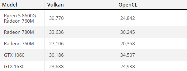 Wynik Radeona 760M wypada nieco lepiej od karty Nvidii Geforce GTX 1060. Ryzen 5 8600G miał uzyskać wynik 30 770 punktów w teście „Vulkan” oraz 24 842 punkty w teście „OpenCL”. Obydwa wyniki są bardzo dobre, jak na iGPU. Omawiany dzisiaj chip graficzny powinien mieć osiem jednostek obliczeniowych i 512 rdzeni shaderów GPU. Jednostka jednak pozostaje dalej w tyle za Radeonem 780M o którym powiemy nieco później.