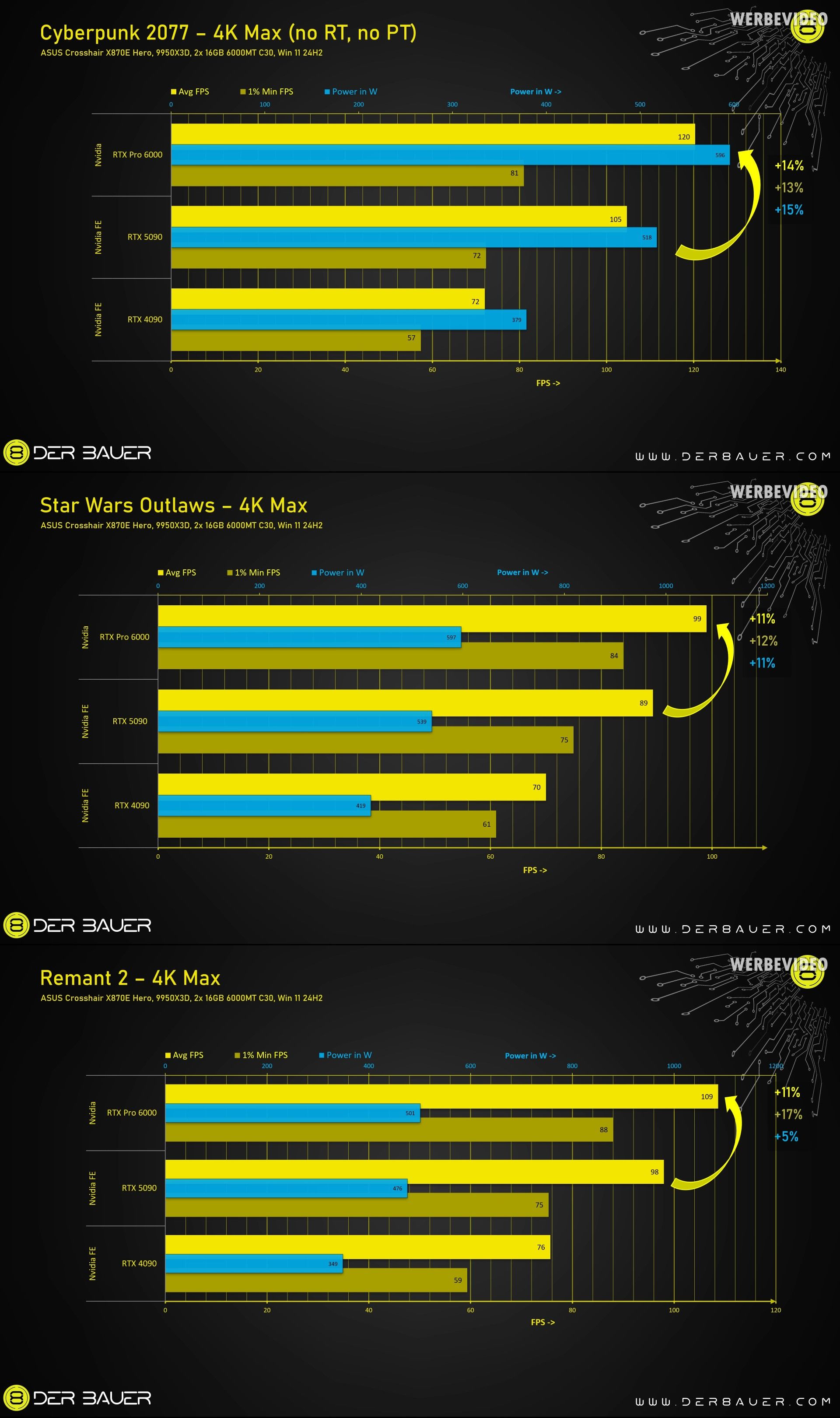 Youtuber technologiczny der8auer dostał w swoje ręce RTX-a Pro 6000 i postanowił sprawdzić go w praktyce. Poza standardowymi benchmarkami, karta graficzna została sprawdzona bezpośrednio w kilku grach. Wyniki mogą zaimponować. W takich grach, jak Cyberpunk 2077, Star Wars Outlaws i Remnant 2, RTX Pro 6000 osiągnął wyniki lepsze o kilkanaście procent od swojego gamingowego odpowiednika.