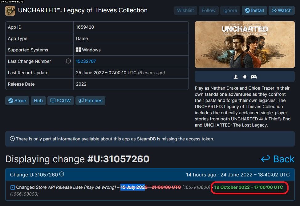 Pakiet gier Uncharted: Legacy of Thieves Collection może zadebiutować na pecetach 19 października tego roku, według informacji udostępnionych w serwisie SteamDB. Portal ten bazuje na danych pochodzących z bazy danych Steama i cieszy się sporą wiarygodnością, mimo to do podanego terminu lepiej podejść z rezerwą – to może być tylko tzw. placeholder.