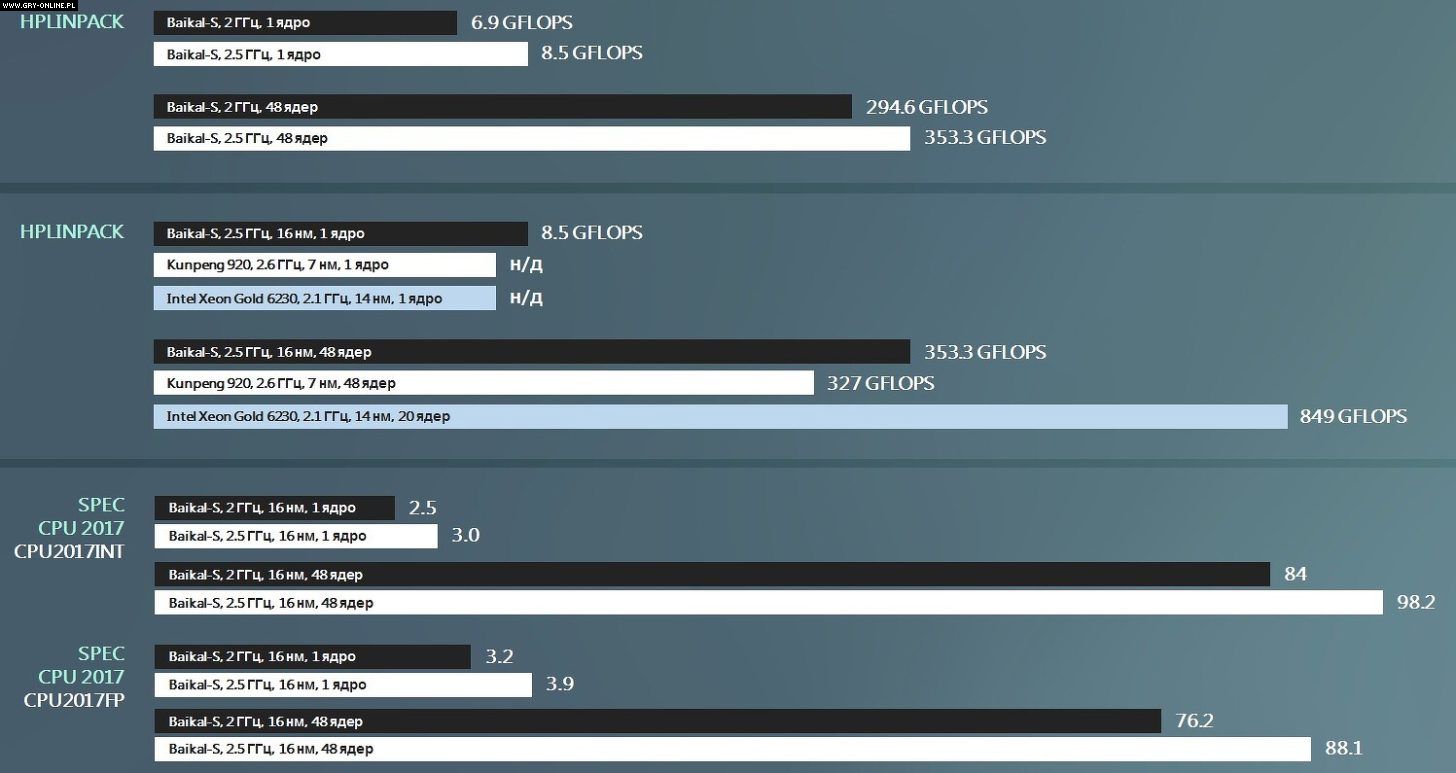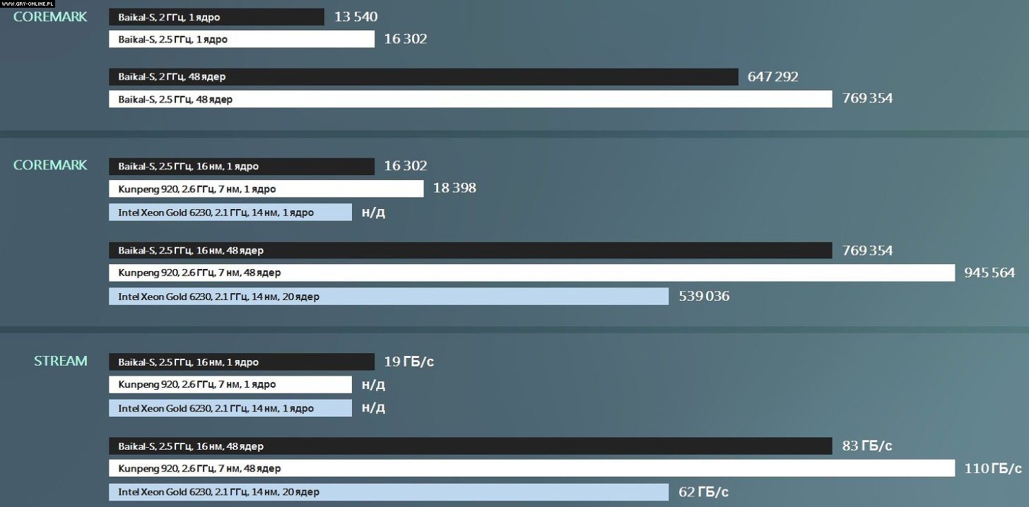 W testach porównawczych Baikal-S zmierzył się z procesorami Xeon Gold 6230 i Kunpeng 920. Warto przy tym zauważyć, że układ od Intela miał swoją premierę w 2019 roku. Dodatkowo procesor ten posiada jedynie 20 rdzeni, co stawia go na przegranej pozycji względem rosyjskiego czipu.