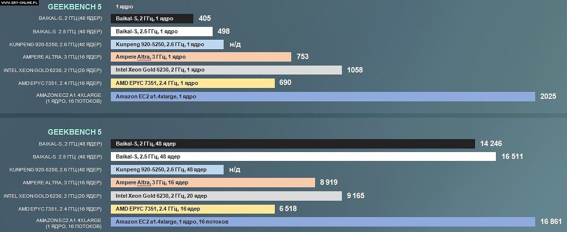 Jednak całkiem inaczej sytuacja wygląda w popularnym benchmarku Geekbench. W przypadku tego testu Xeon oraz Kunpeng pokonują rosyjski układ w teście jednowątkowym. Należy jednak zaznaczyć, że procesor od Intela nie może dorównać konkurentom w teście wielowątkowym, co najprawdopodobniej spowodowane jest o wiele niższą liczbą rdzeni.