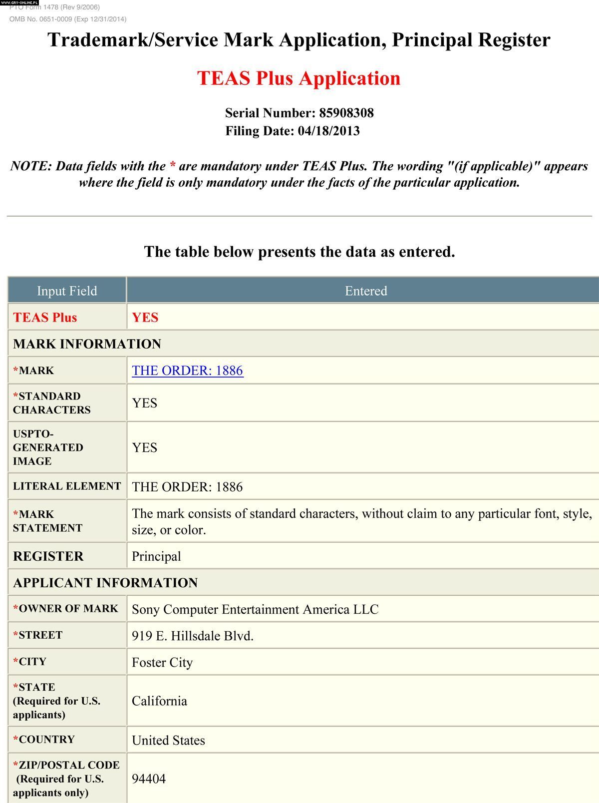 Firma Sony Computer Entertainment America zarejestrowała nazwę The Order: 1886 w amerykańskim Urzędzie Patentowym. Obecnie nie dysponujemy większą ilością informacji, jednak mówi się, że będzie to nowy projekt studia Guerrilla Games.