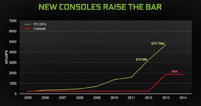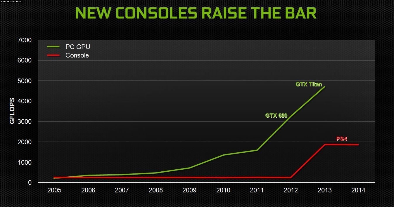 Przedstawiciele Nvidii starali się udowodnić, że ten segment branży przynosi większe zyski niż jej konsolowe odpowiedniki, a nad grami pracuje w nim prawie tylu deweloperów ilu na wszystkich platformach Sony, Microsoftu czy Nintendo razem wziętych. Jak pokazano na slajdach, prognozowane przychody ze sprzedaży gier na PC w 2015 roku wyniosą około 20 miliardów dolarów, podczas gdy u konkurencji osiągnie ona pułap niespełna 10 i 6 miliardów. Kolejna porcja statystyk dotyczyła mocy pecetowych układów Nvidii oraz wydajności procesorów graficznych konsoli Sony. Na wykresie uwidoczniono te różnice, porównując możliwości najnowszej karty GeForce GTX Titan z układem konkurencyjnego ATI, który znajdzie się w PlayStation 4.
