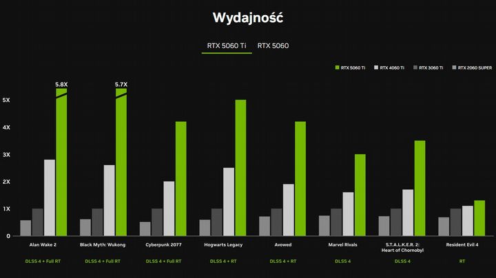 Tak, jak w przypadku wcześniejszych modeli RTX-ów 50, tak i 5060 Ti otrzyma dostęp do DLSS 4 i multigenerowania klatek. To, według Nvidii, zwiększa wydajność karty graficznej, która w grze Alan Wake 2 miałaby charakteryzować się prawie sześć razy większą mocą względem RTX-a 3060 Ti i prawie dwa razy większą w porównaniu do RTX-a 4060 Ti.