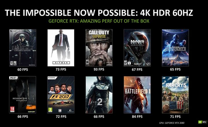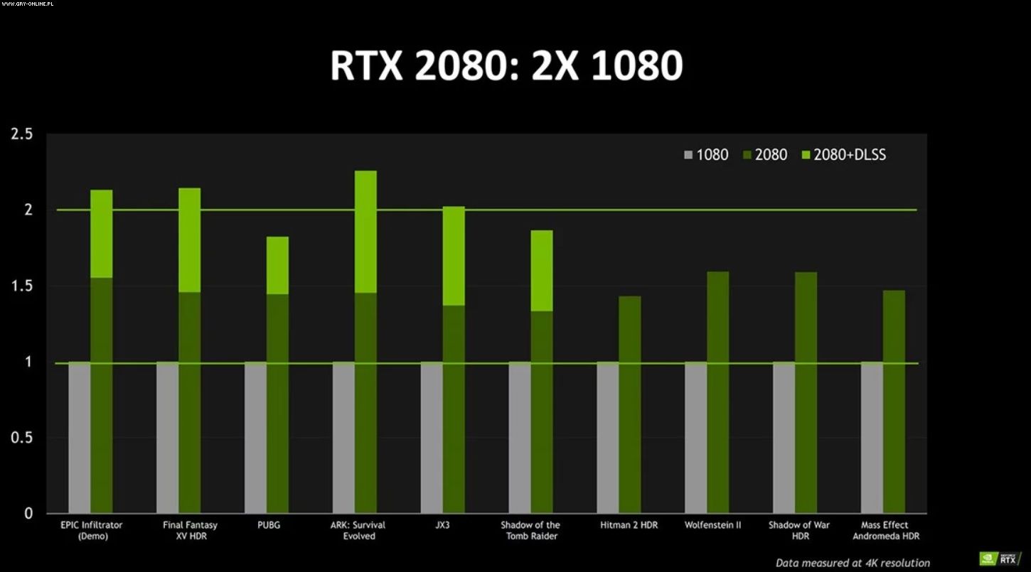 Jednak nie wszystkie gry będą w stanie skorzystać z dodatkowych efektów, jakie oferują karty z rodziny RTX. Wielu graczy zastanawiała się zatem, czy nowe GeForce’y zaoferują zauważalny wzrost wydajności w tytułach starszych i nie obsługujących technologii ray tracingu. Przedstawiciele Nvidii zaprezentowali garść danych sugerujących duży skok jakościowy między RTX 2080 i 1080.