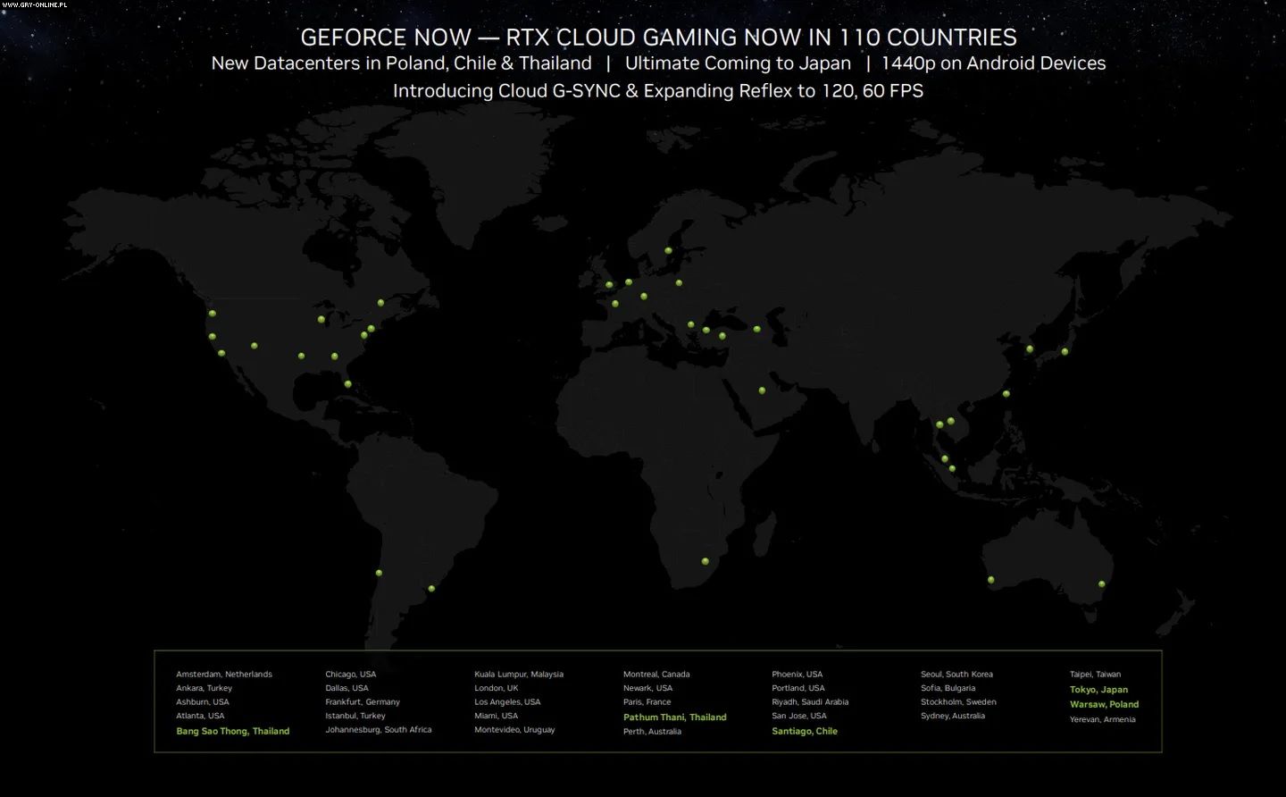 Jedną z najważniejszych informacji udostępnionych przez „zielonych” jest ogłoszenie kolejnych dwóch krajów w których umiejscowione będą serwery GeForce NOW. Jednym z nich ma być Japonia, zaś drugim Polska. Serwer w naszym kraju będzie umiejscowiony w Warszawie. Niestety nie podano kiedy dokładnie będą one dostępne. Można jednak założyć, że serwery zostaną oddane do użytku do końca bieżącego roku. Poniżej możecie zobaczyć mapę na której zaznaczone, gdzie mają powstać serwery usługi GeForce NOW.