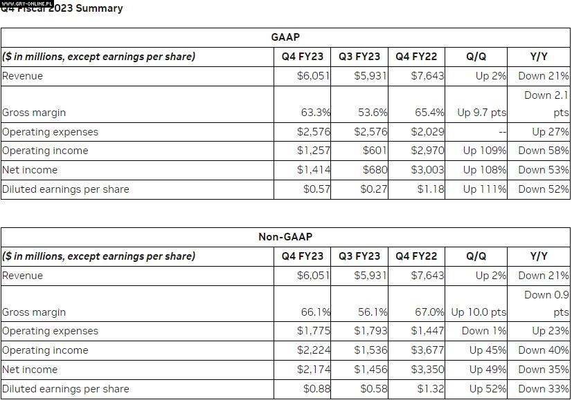 Raport finansowy wskazuje, że sytuacja Nvidii wygląda bardziej obiecująco, niż wyobrażali to sobie analitycy z Wall Street. Czwarty kwartał ubiegłego roku oznaczał przychody na poziomie 6,05 miliarda dolarów, co oznacza spadek o 21%, porównując z analogicznym okresem roku wcześniejszego. Należy jednak zauważyć, że prognozy analityków zakładały przychody w wysokości 6,02 mld dolarów.