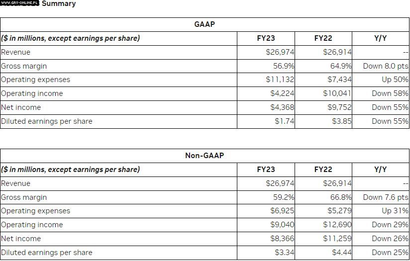 Spadki nie przeszkodziły jednak Nvidii w uzyskaniu przychodu na poziomie 26,974 mld dolarów w roku fiskalnym 2023, co jest wynikiem nieco wyższym od poprzedniego (26,914 miliarda dolarów).