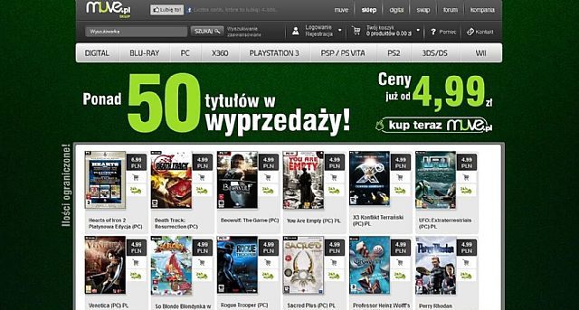 Sklep muve.pl obniżył ceny kilkudziesięciu pecetowych tytułów z różnych kolekcji wydawniczych. Najtańsze z nich można kupić już od 4,99 złotych. Promocja trwa do wyczerpania zapasów, zatem jeśli chcecie upolować coś dla siebie warto się pośpieszyć.