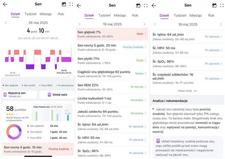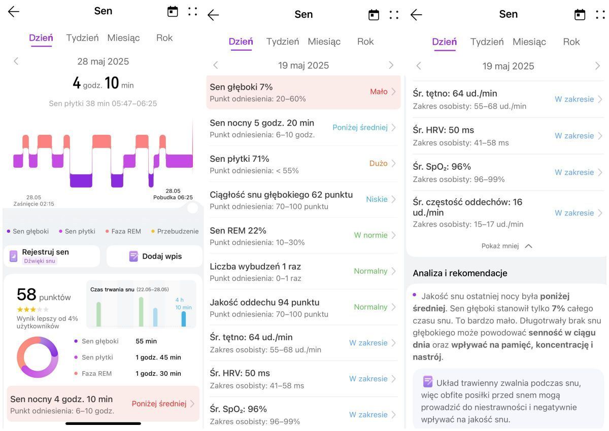 Dane z pierwszego tygodnia były brutalne: faza głębokiego snu stanowiła zaledwie 8-10% całej nocy (norma to około 25%), czas zasypiania przekraczał godzinę, a liczba wybudzeń często sięgała 10 razy na noc. Wreszcie miałam potwierdzenie tego, co czułam – mój sen rzeczywiście był w katastrofalnym stanie.